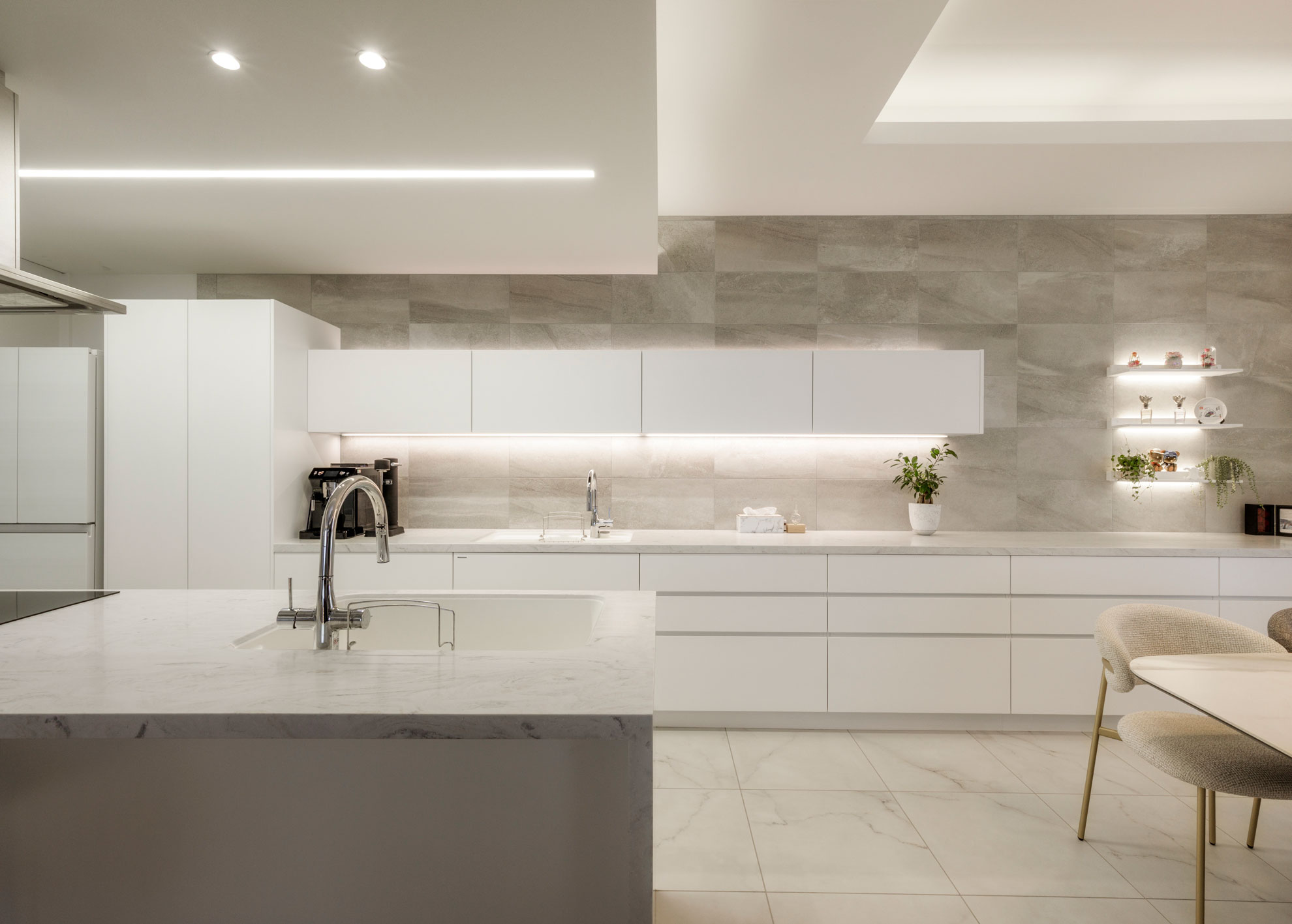 キッチンはアイランド式を採用。アイランド部分にはもうひとつのシンクも設置し、素敵な照明環境の中で、多人数でも楽しく調理や後片付けが効率よく行える。