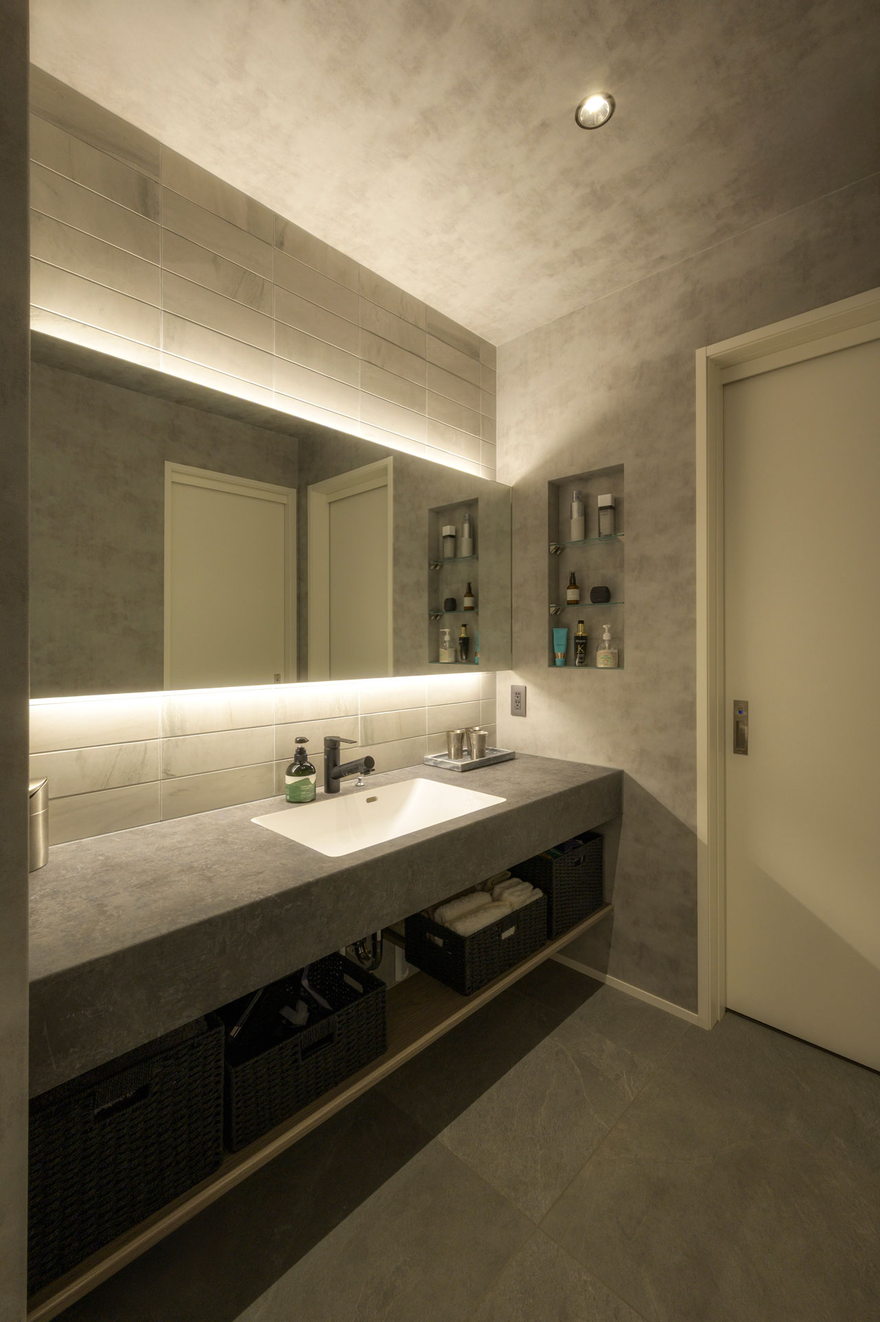 サニタリーのエリアも居室と同様にインダストリアルスタイルを取り入れたインテリアに。特に洗面室はシックな色調に効果的な照明を用い、スタイリッシュな印象を加えている。