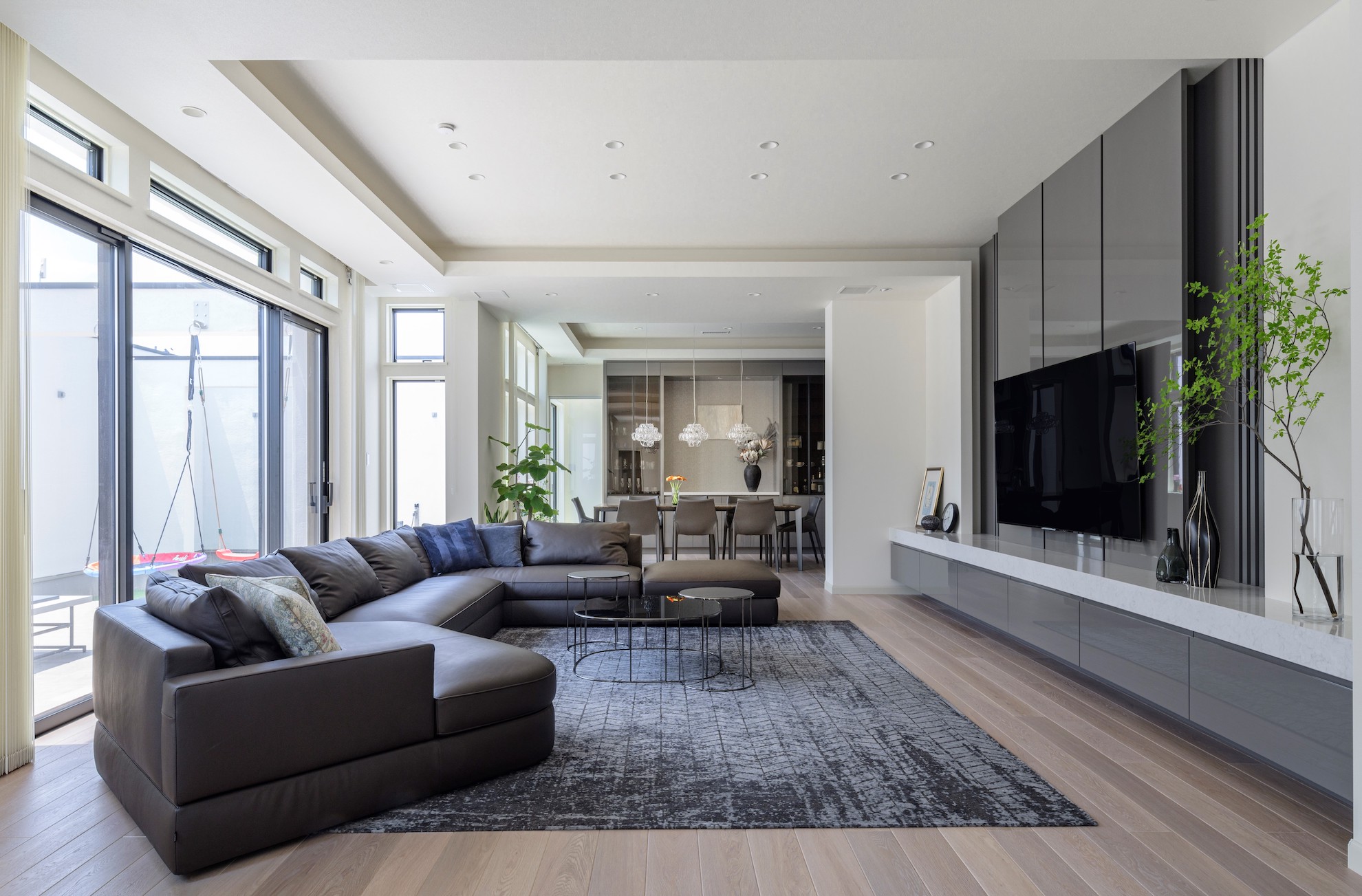 新居ではホームパーティーもできるように、玄関からホール、ピット状のキッズスペース、LDKがフラットに連続する開放的な空間に。