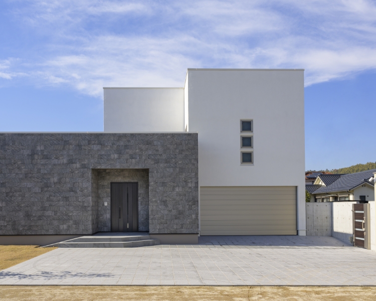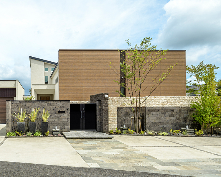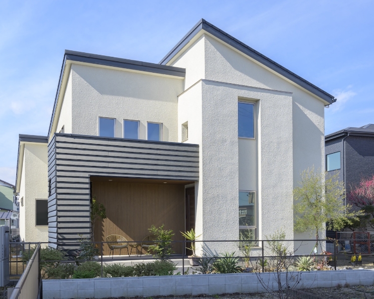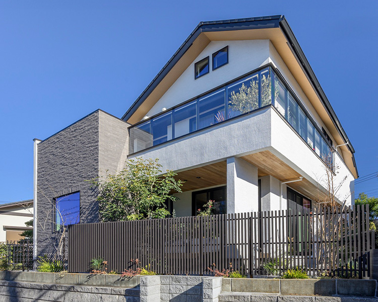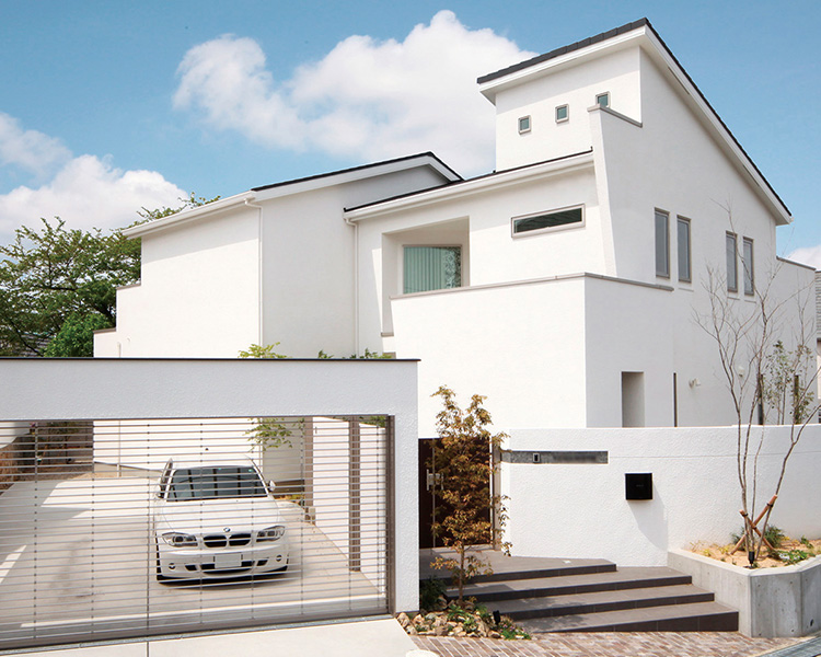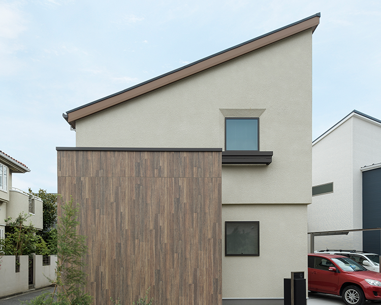 緩勾配の片流れ屋根はご主人の要望によるもの。シャープな輪郭が美しく映えます。