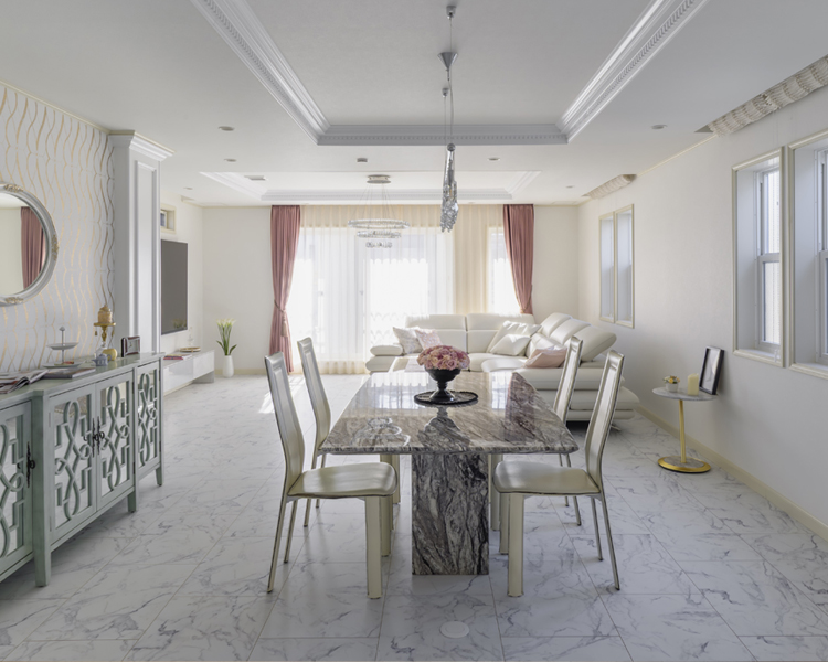 庭に面した大きな開口部から日差しをたっぷり取り込める、吹き抜けのあるLDK。インテリアはホワイトオークの色調でまとめ、一段下げたピットリビングは優しいくつろぎの場となっている。