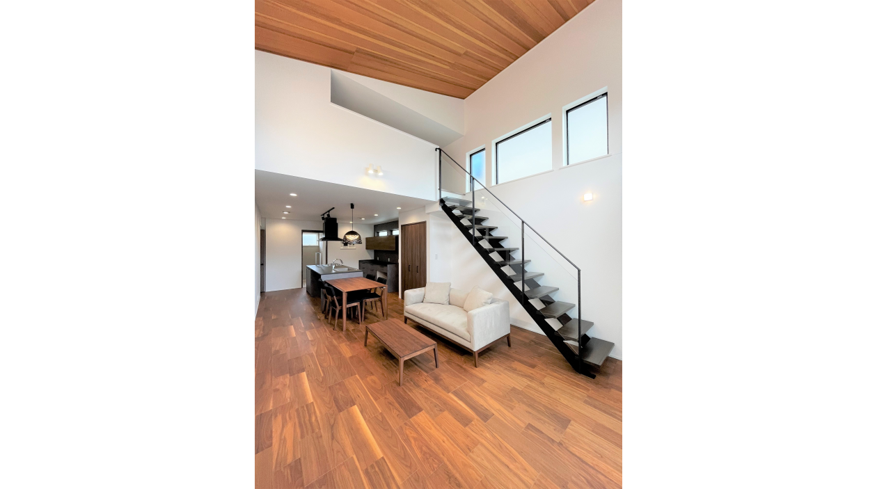 開放感抜群の設計 : リビング勾配天井 × スケルトン階段 × ロフト