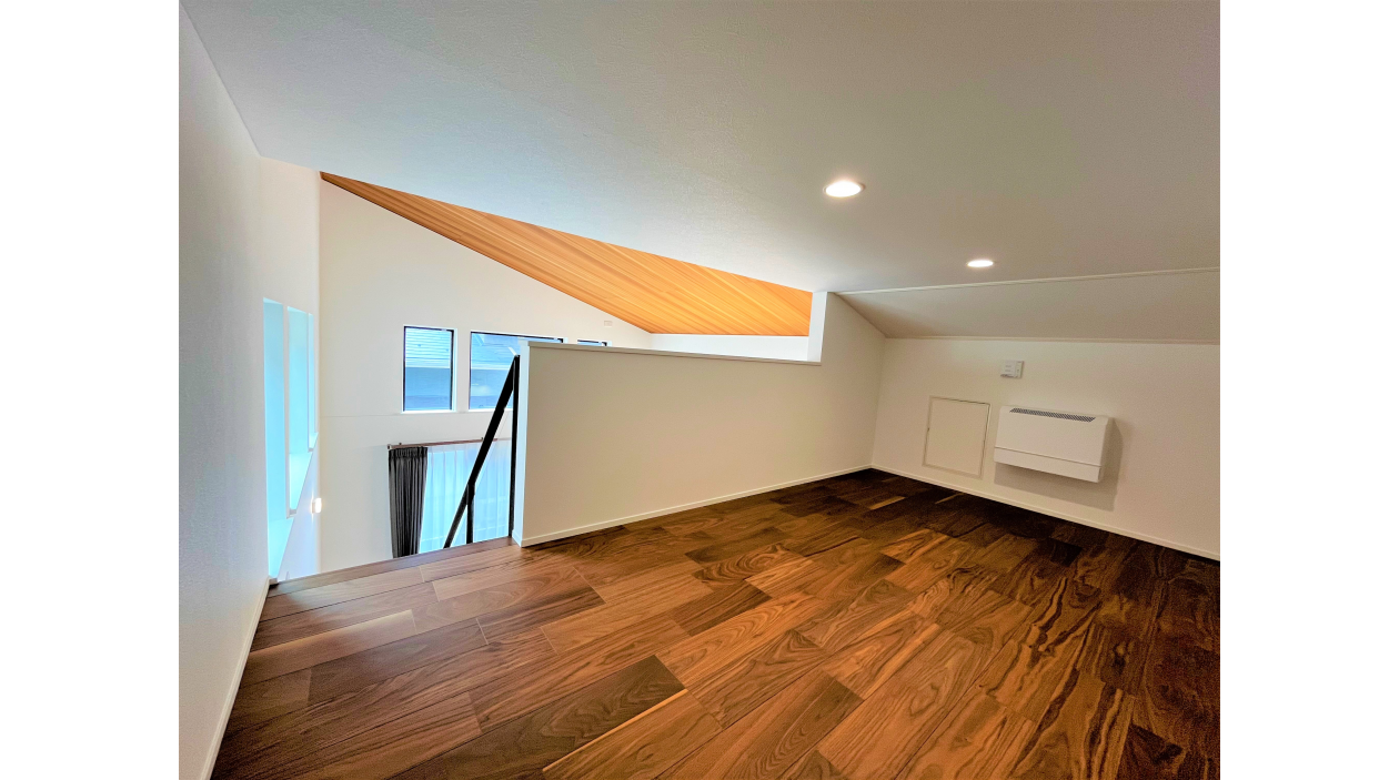 リビングの勾配天井とスケルトン階段が生み出す圧倒的な開放感。 平屋でありながら、約5帖の広々としたロフトを備え、季節ものや趣味の道具もすっきり収納可能です。さらに、三井ホーム独自の全館空調「スマートブリーズ・ワン」により、家中どこにいても温度差のない快適な暮らしを実現。階段の昇り降りがないフラットな動線は、子育て世代からシニア世代まで、長く安心して住み続けられる「終の棲家」としても最適です。
