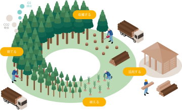 木は火に強く、耐震性、断熱性、調湿作用に優れた構造材であるだけでなく、地球温暖化の原因のひとつである二酸化炭素(CO₂)を吸収し、酸素をつくり出す、持続可能な資源です。