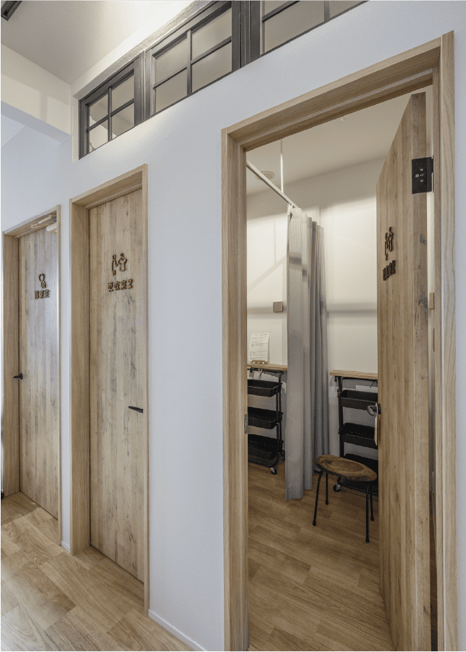 患者様の気持ちを第一とされる岡先生がお持ちだった具体的なイメージを具現化することに注力。受付や待合室は既存の間取りを活かしつつ、のびやかな天井には化粧梁を施し、受付廻りは造作家具による作り込みをご提案。カフェで過ごすひとときの延長に受診があるような木のぬくもりあふれる空間づくりを行いました。マンモグラフィ用に間取りを変えて新設したレントゲン室も無機質な雰囲気にならないよう、木調の内装仕上げに。以前は院長空間だった2階はスタッフ空間として変更。洗面室を広げ、ガス乾燥機のスペースを確保しています。