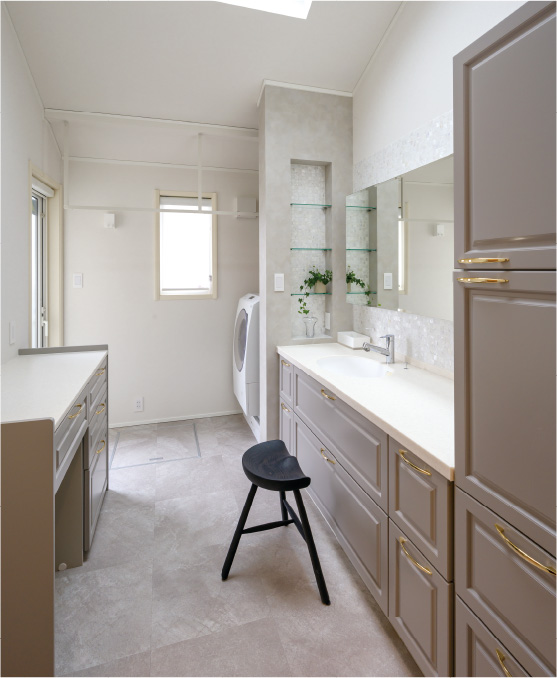 洗面室の広さを見直して、 ランドリールームを設けるのもおすすめ。