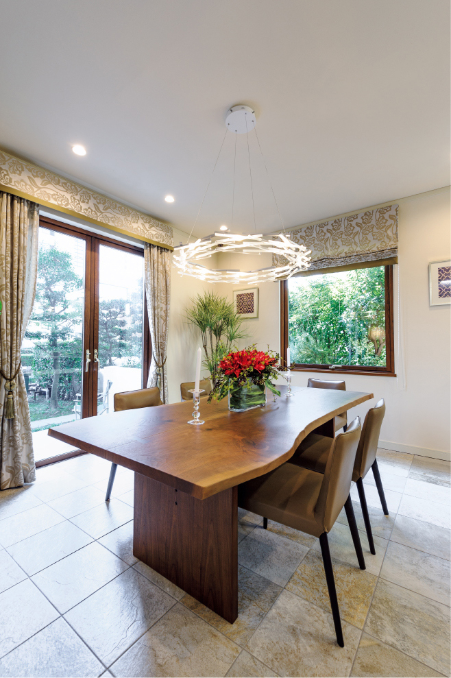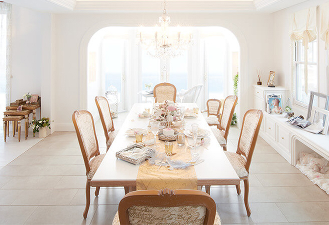 優雅なひと時を過ごせる、エレガントなダイニング空間。モダンな魅力を見せる白で統一された美しい空間に、シャンデリアが上質な華やかさをプラス。複数置くため、ダイニングの雰囲気に大きく影響する椅子は、主張しすぎない遊び心のあるこだわりのファブリックがポイント。空間になじみながらもアクセントとなり、会話のはずむ楽しいムードを演出してくれています。