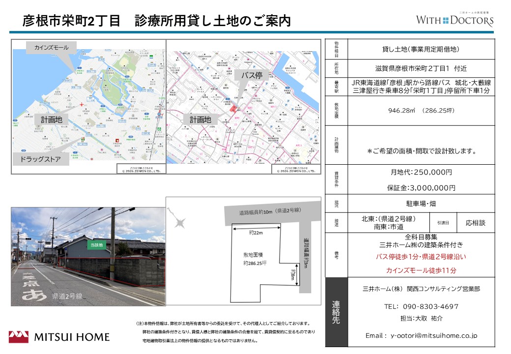 • ※「ドクターズレントハウス」として掲載されている情報は弊社が土地所有者等の委託を受けて、その代理人としてご紹介しております。ご紹介している土地上にお医者様のご要望も活かした建物を土地所有者の方が建築し、土地所有者の方を貸主とした建物の賃貸借契約に至るものであって貸地・売地の情報ではありませんので、宅建業法上の物件情報の提供となるものではありません。建物の内容、賃貸借条件等は今後協議していただき決定していくことになります。
