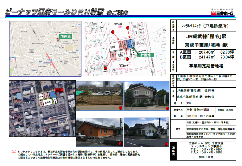 JR総武線「稲毛駅」より徒歩約7分で、周辺に保育園・公園があります。南側に「稲毛病院」、西側に小児科クリニック・歯科クリニックに隣接しており、患者様に認知されやすい立地です。