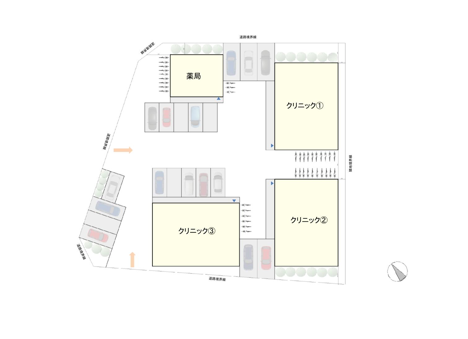 建物を50坪とした場合、3つの診療所・駐車場19台程度を敷地内に設置可能です。駐車場代は別途かかります。